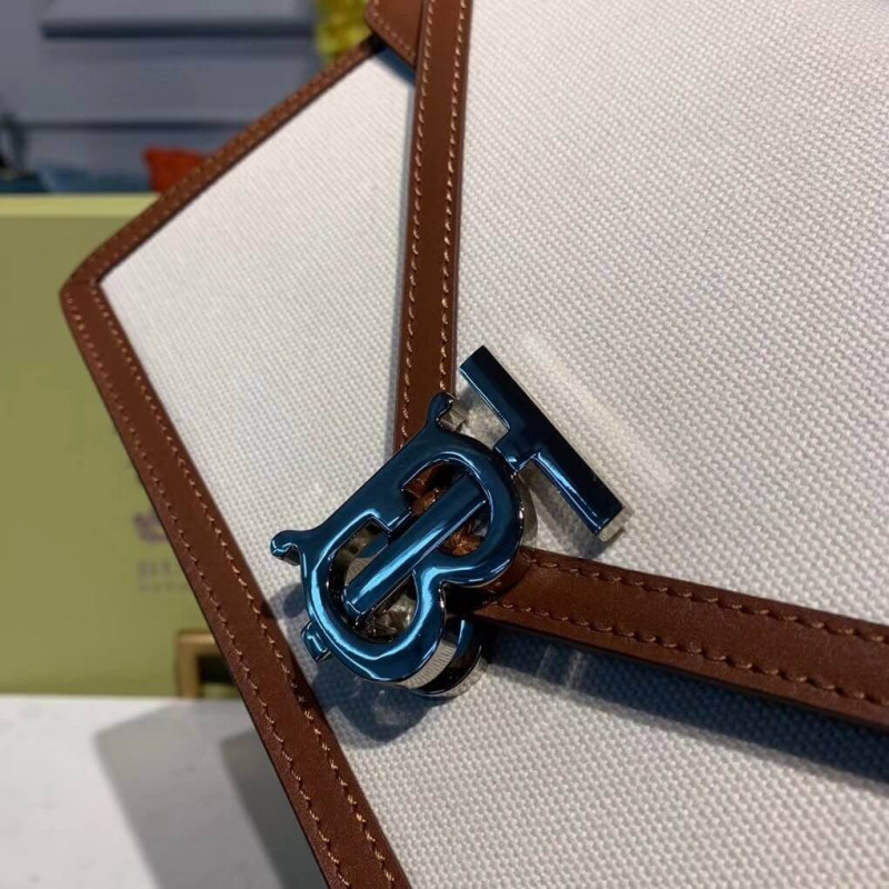 Une toile et un embrayage d’enveloppe en cuir avec un fermoir de monogramme Thomas Burberry, retravaillant un style des années 1930 à partir de l’archive.
