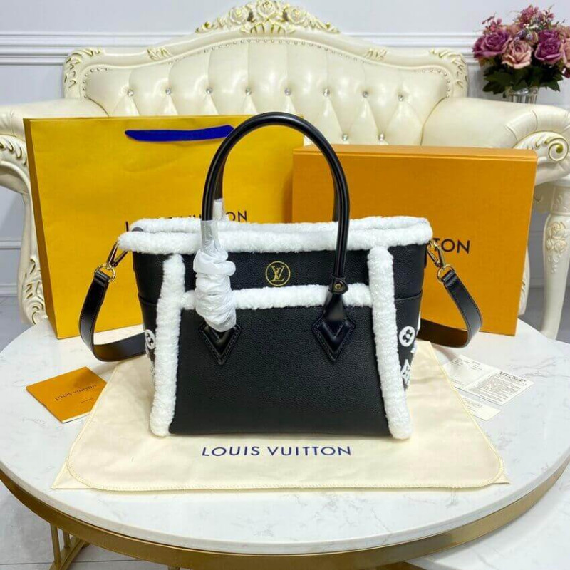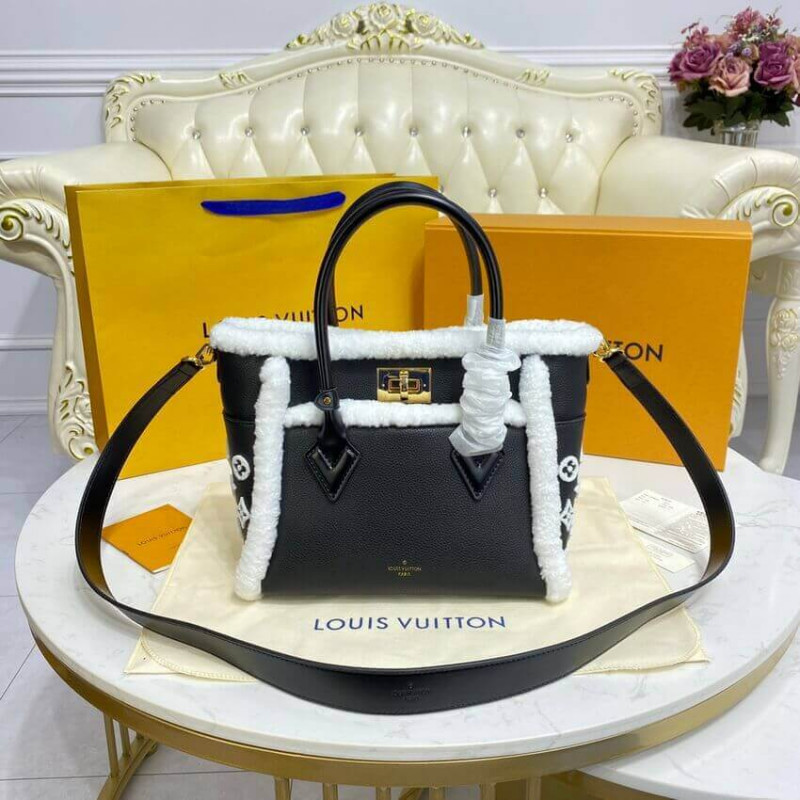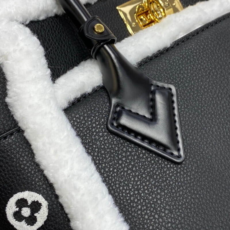 Le sac à main sur mon côté PM est fabriqué à partir de cuir de veau grainé et de cisaillement pour une sensation hivernale réconfortante. La couleur chaude du caramel de la peau de veau est parfaitement complétée par la garniture en laine de shearling. Le monogramme de touffage sur les côtés met en évidence le style de signature. Une sangle amovible et deux poignées supérieures permettent de nombreuses options de transport.