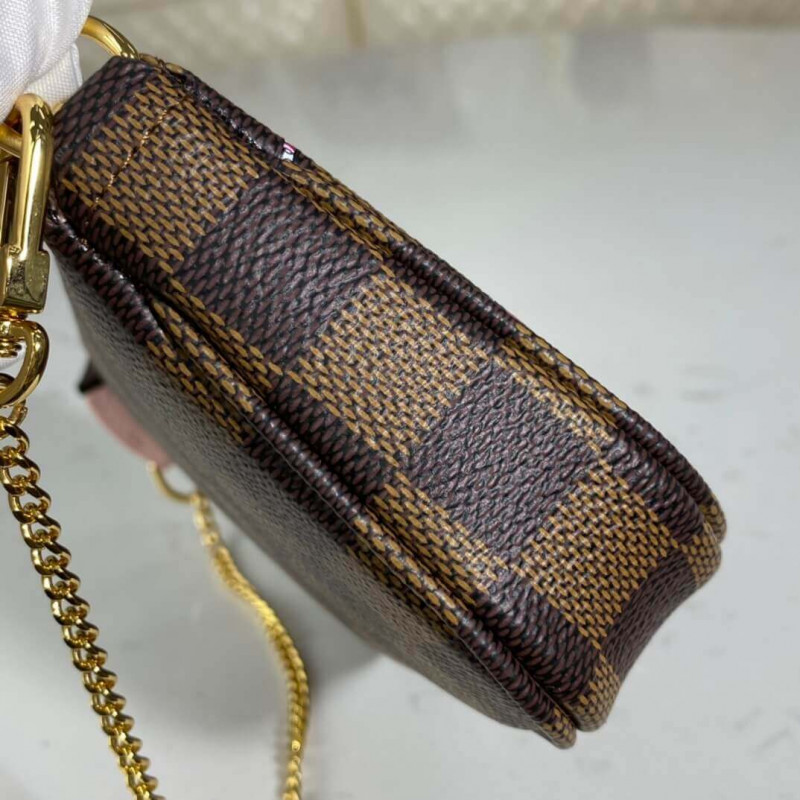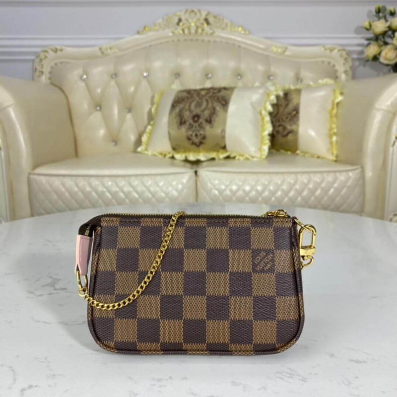 La mascotte de Louis Vuitton Vivienne est photographiée en s’amusant dans une foire sur cette édition de Noël 2020 de la Mini Pochette Accessoires dans Damier Ebene Canvas. Les illustrations joyeuses mettant en vedette des symboles de maison capturent l’esprit de la saison. Cette pochette peut être attachée à une ceinture ou un sac grâce à sa chaîne de tons d’or.