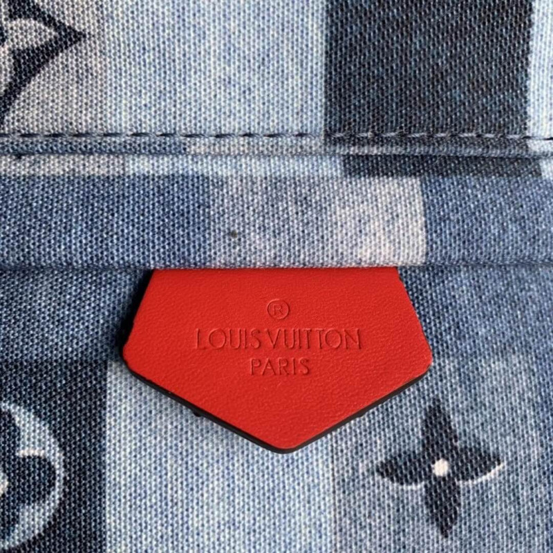 Ce mini sac à dos Palm Springs arbore un motif de patchwork unique composé de motifs damier et monogrammes. Imprimé directement sur le corps en toile du sac, le bleu de jean brut et lavé créent une illusion surprenante de texture. Les sangles en cuir rouge et les garnitures apportent un pincement de contraste vif au mélange.