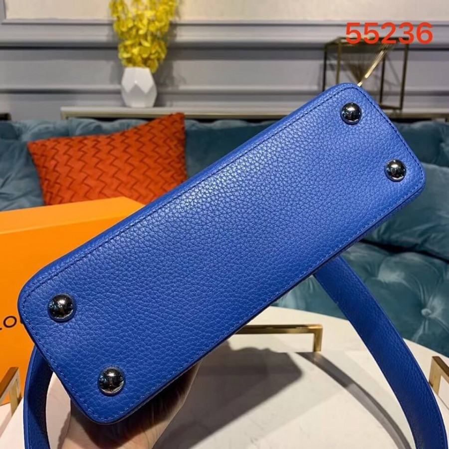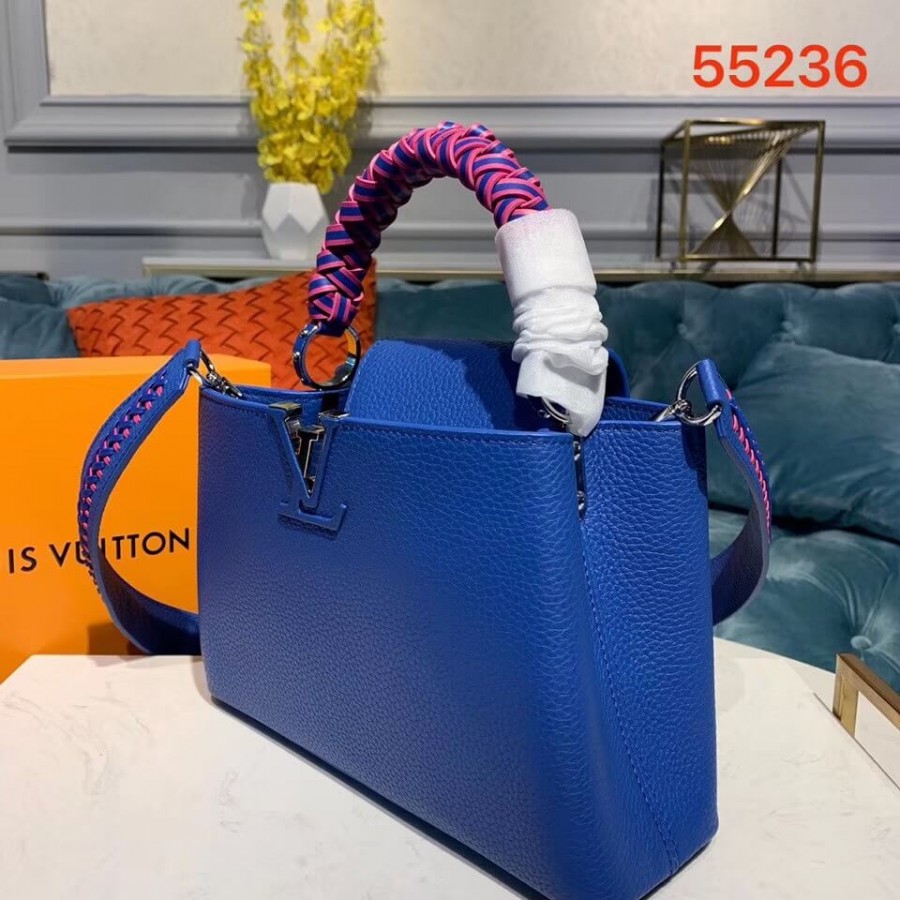 Le sac à main BB Capuccines en cuir souple Taurillon prend une sensation ludique avec sa poignée tressée et sa sangle. Fabriqué de fils en cuir contrastés, la tresse apporte une sensation d’artisanat à ce sac emblématique pour l’automne 2019. Le sac peut être transporté avec le volet ou niché à l’intérieur pour révéler les initiales LV en couleur argentée.