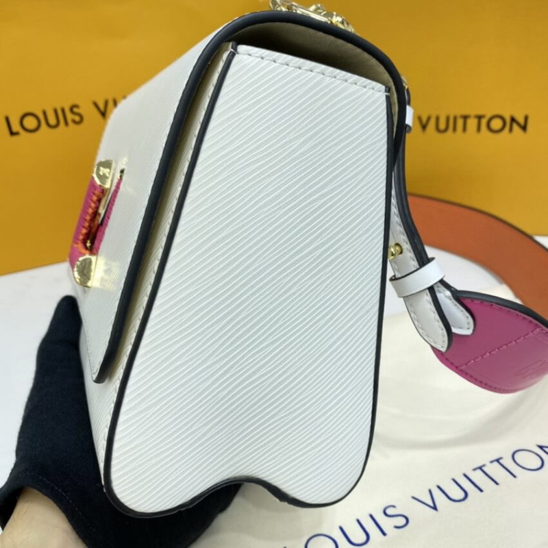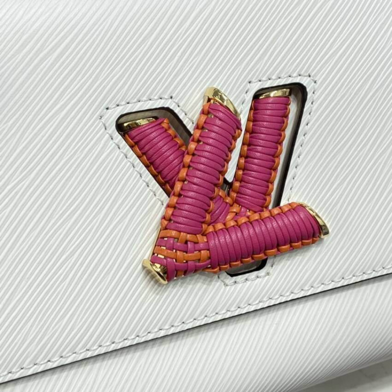 Louis Vuitton épise le sac à main Twist MM emblématique avec un tressage en cuir bicolore sur la serrure LV Twist et la sangle en cuir en trois couleurs. La large sangle présente une signature de Louis Vuitton débossée d’un côté, et un mini motif monogramme en relief de l’autre. Une poignée de chaîne en couleur dorée permet un transport à main et au coude.