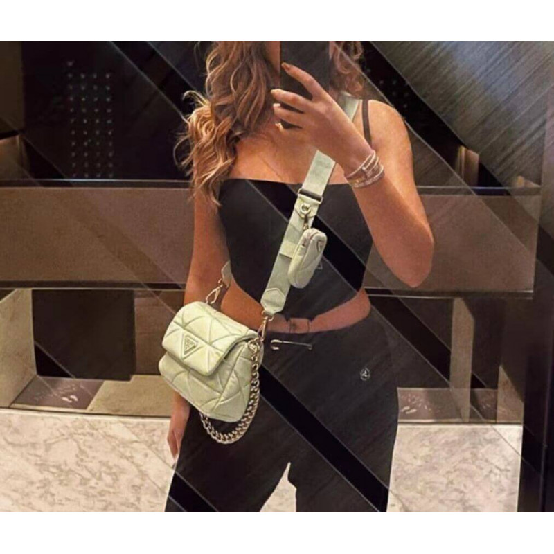 Réinterprétée de toujours de nouvelles manières, le triangle emblématique de Prada apparaît dans le motif perforé cousu de ce sac à bandoulière en cuir souple, créant un motif de patchwork. Un mini-poche amovible, un élément distinctif parmi les accessoires de la marque, complète le sac à bandoulière et ajoute une note contemporaine et polyvalente au style. STRAPE ARRIGHE ARRIGNÉE À 95 cm ROGO